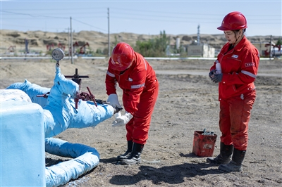 6月19日,在新疆油田公司呼图壁储气库生产现场,一线员工顶着烈日对设备进行逐一检查。薛梅 摄