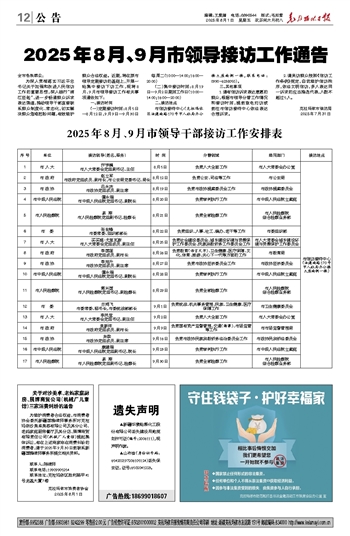 为深入贯彻落实习近平总书记关于加强和改进人民信访工作的重要思想,深入践行“浦江经验”,进一步畅通群众诉求表达渠道,推动领导干部直接联系群众制度化、常态化,切实解决群众急难愁盼问题,有效维护群众合法权益。近期,将在原市领导定期接访的基础上,开展一轮集中接访下访工作,现将8月、9月市领导接访工作有关事项通告如下: