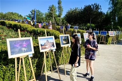 8月6日,市区九龙潭景区,市民正在欣赏摄影作品。克拉玛依区文体旅游局将克拉玛依区“第二十二届百日文化广场、乡村百日文体竞赛”评选出的优秀摄影作品在九龙潭景区展出,以飨市民和游客。这些摄影作品涵盖了克拉玛依城市的绚丽风光与深厚的人文底蕴,与九龙潭美景相得益彰。
