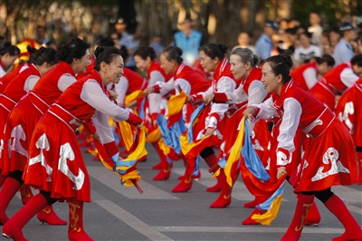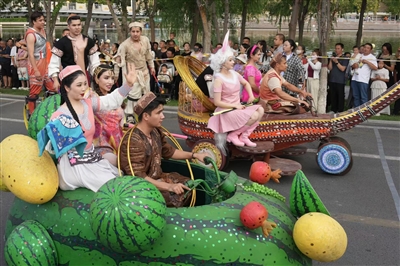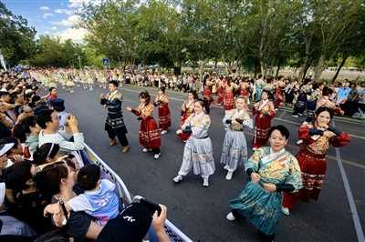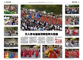 8月9日傍晚,克拉玛依河畔北岸,“狂欢大巡游”的队伍正在行进中,道路两旁挤满了市民和游客,他们兴致勃勃地观赏马术、杂技、舞龙舞狮、歌舞等表演。