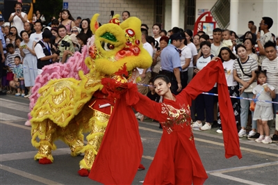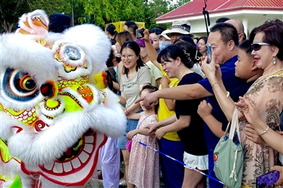 舞狮表演中,一只灵动的“狮子”与游客互动。