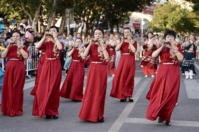 非遗方队在巡游中,表演者用克拉玛依紫砂烧制而成的哨埙,吹奏出婉转悠扬的音律。