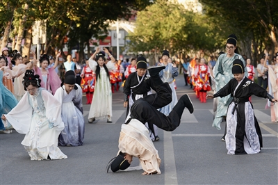 舞者身穿传统服饰,表演舞蹈《大展宏图》。