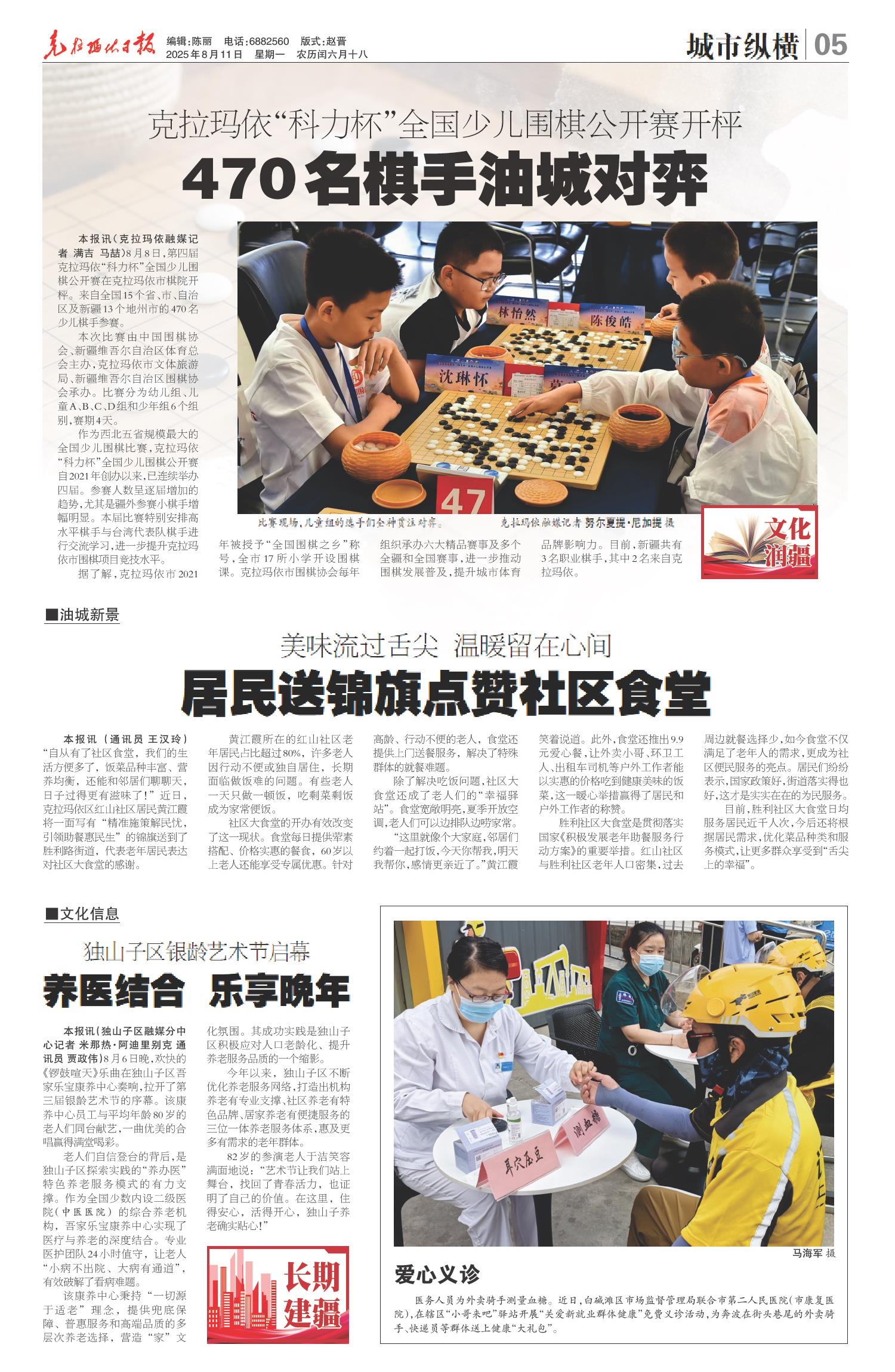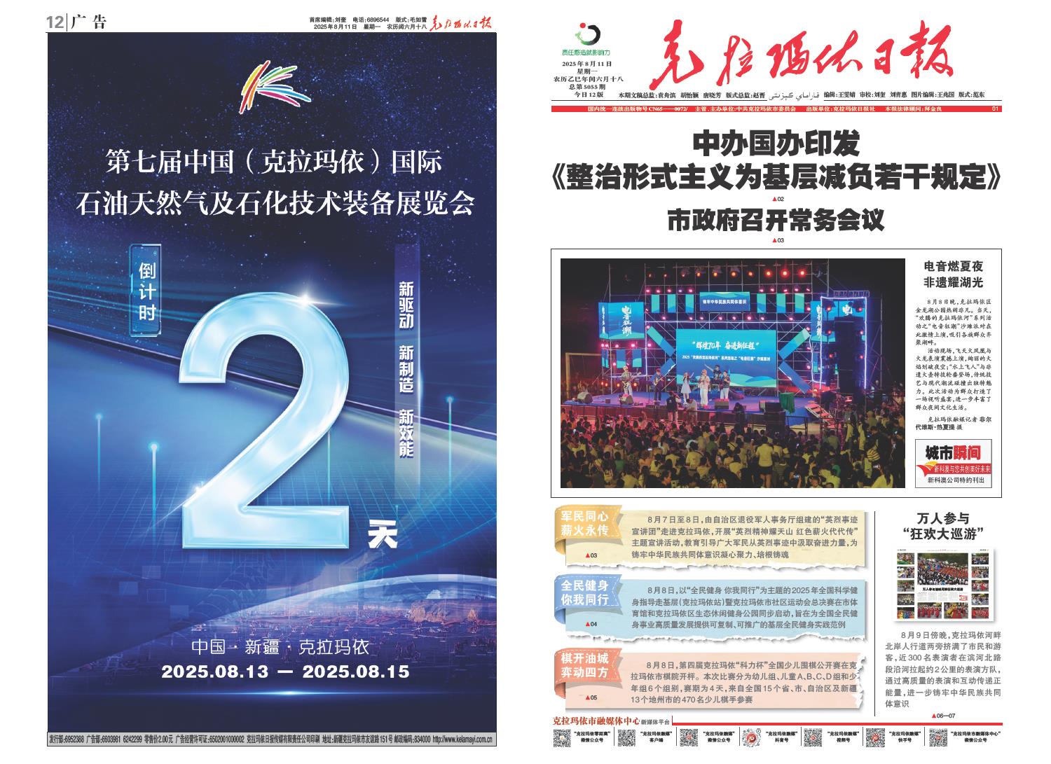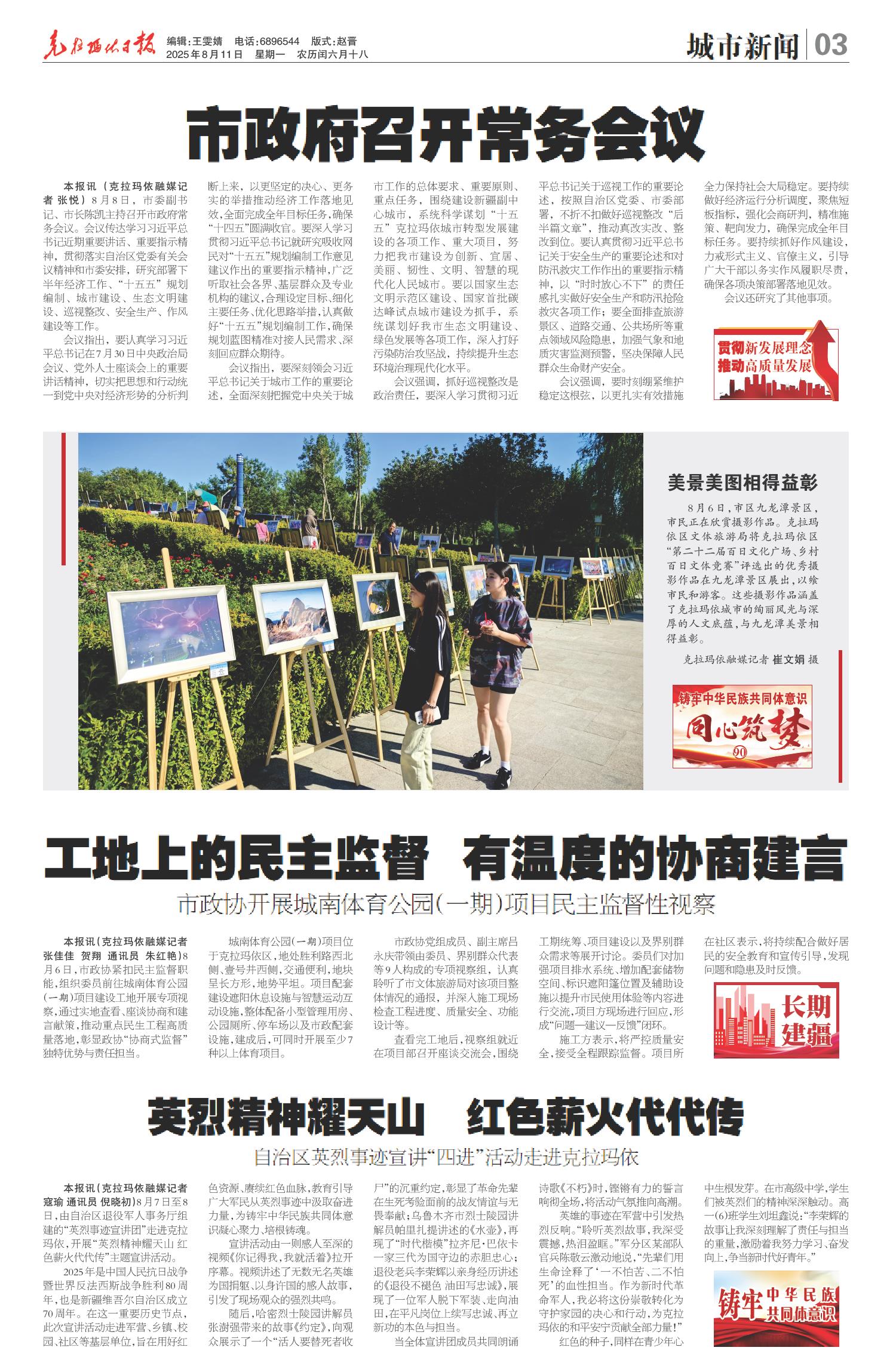 A01 本期导读 A02 要闻 A03 城市新闻 A04 城市新闻 A05 城市纵横 A06 城市影像 A08 寻访他乡克拉玛依人 A09 庆祝克拉玛依油田勘探开发70周年 A10 公告 A11 油城艺苑 A12 广告