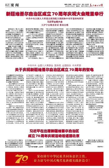 王沪宁发表讲话。他说,70年前,在党中央亲切关怀和党的民族政策光辉照耀下,新疆维吾尔自治区宣告成立。70年来特别是新时代以来,在党的领导下,新疆各族人民共同当家作主,不断夺取社会主义革命、建设和改革开放的伟大胜利。以习近平同志为核心的党中央坚持从战略上审视和谋划新疆工作,确立新时代党的治疆方略,推动新疆各项事业取得历史性成就,新疆同全国一道打赢脱贫攻坚战、全面建成小康社会,新疆各民族大团结不断巩固深化、中华民族共同体意识深入人心,各族人民像石榴籽一样紧紧抱在一起、昂首阔步走在中国式现代化道路上。