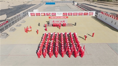 9月22日,吉庆油田作业区(吉木萨尔页岩油项目经理部)在吉172_H功勋井前举行决胜国家级陆相页岩油示范区建设百日誓师大会暨青年突击队授旗仪式。