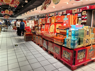 走进各大商场超市,月饼专区、专柜设置在入口处等显眼位置,“月满中秋”的宣传牌温馨雅致,各式礼盒堆叠成山,吸引着消费者驻足挑选。