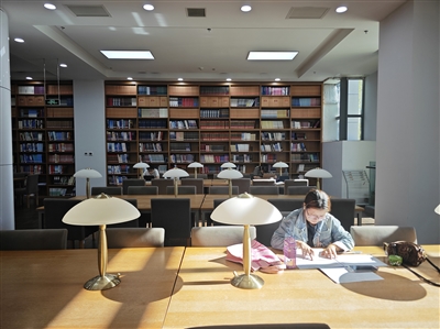 城市书屋内,有人捧着书轻轻倚靠在书架旁阅读,有人靠坐在木色的桌凳上,沉浸于文字中,“哗哗”的翻书声让秋日多了几分诗意。