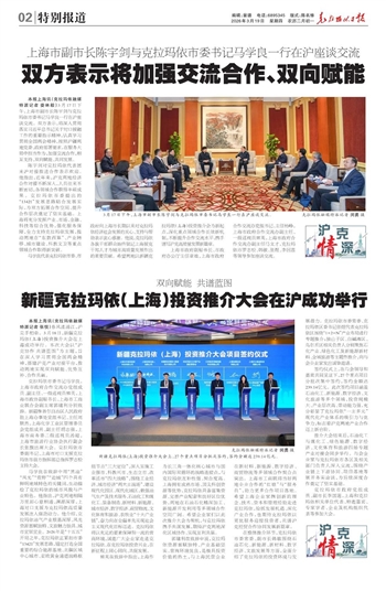 本报上海讯(克拉玛依融媒特派记者 张悦)春风漾浦江,沪克手相牵。3月18日,新疆克拉玛依(上海)投资推介大会在上海成功举行。本次大会以“沪克协作 共谱蓝图”为主题,旨在深入学习贯彻全国两会精神,搭建沪克产业对接平台,推动两地实现双向赋能、优势互补、合作共赢。