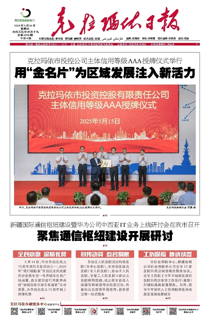 - 用“金名片”为区域发展注入新活力 昨日,克拉玛依市投资控股有限责任公司主体信用评级AAA授牌仪式举行。克拉玛依融媒记者 闵勇 摄