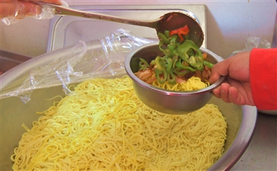 ◀6月22日,准东钻井公司为员工准备了黄面烤肉等清凉午餐。