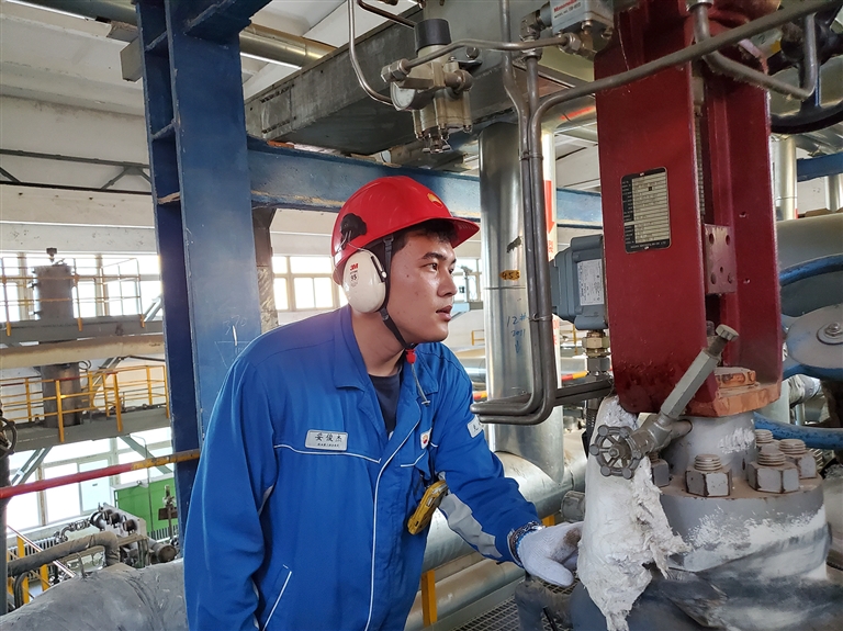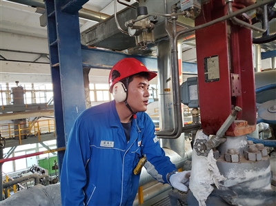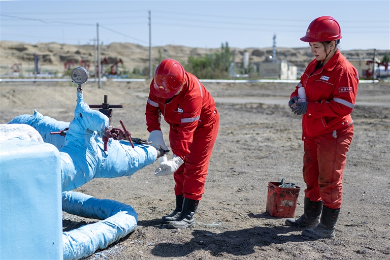 6月18日,克拉玛依石化公司一线员工在高温环境下观察设备运行情况,保障装置安全运行。