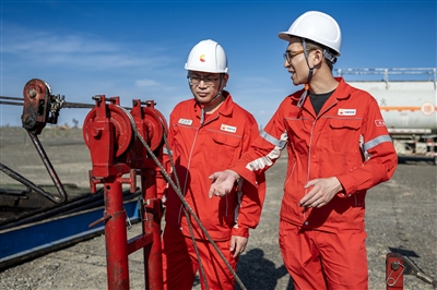 6月18日,新疆油田公司百口泉采油厂员工在修井现场检查修井队作业情况,全力以赴护航高温天气下的生产安全。