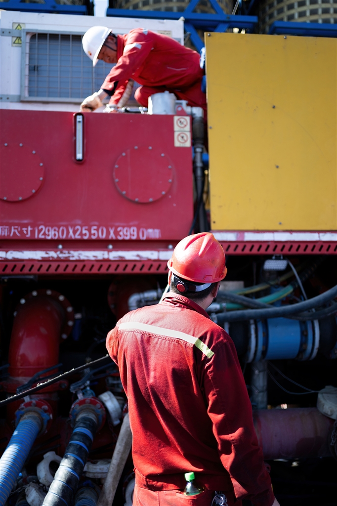 6月17日,在新疆油田公司玛湖勘探开发项目部玛湖油区压裂现场,正在作业的一线员工身上的工服已湿透。