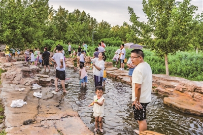 7月20日,克拉玛依市区东郊、准噶尔桥以南区域绿地附近,放暑假的小朋友在家长的陪伴下戏水游玩,享受欢乐与凉爽。自2023年9月起,克拉玛依区开放了通讯花苑区域绿地、晴照台区域绿地、文体中心区域绿地、九龙潭区域绿地等公共绿地,为市民、游客提供了露营野餐、休闲游憩的好去处。