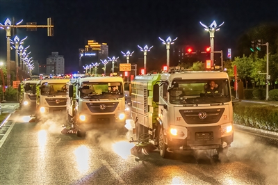 9月26日夜,环卫清扫队在克拉玛依区进行机械化洗地作业。9月中旬以来,为全力保障国庆、中秋及2025克拉玛依马拉松赛事期间的市容市貌,新疆融汇城服公司开展了节前清洁行动,日出动车辆196车次,对城区重要路段及交通岛、路口周边区域进行清洗,并组织全体保洁人员对城区3740余处公交站台、果皮箱、宣传牌等公共设施进行擦拭,持续加大城区环境卫生保障力度,以实际行动向自治区成立70周年、克拉玛依油田勘探开发70周年献礼。