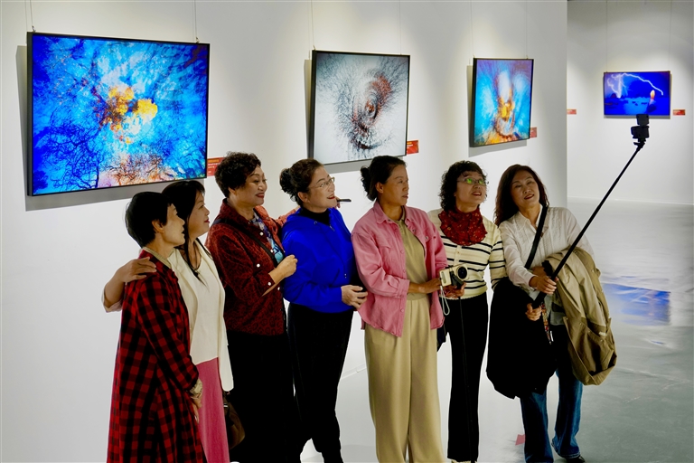 9月27日,克拉玛依科技馆,相约一起观展的市民在郭新摄影艺术作品前合影留念。