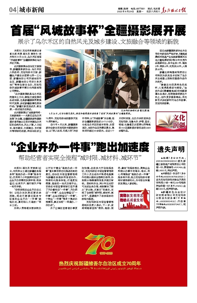 - 首届“风城故事杯”全疆摄影展开展 本报讯(克拉玛依融媒记者 崔文娟 闵勇 通讯员 唐努尔·库米热尔)9月26日,乌尔禾区首届“风城故事杯”全疆摄影展在乌尔禾区开展。 此次摄影展由自治区文联指导,新疆摄影家协会、乌尔禾区人民政府