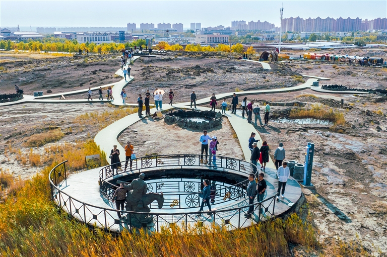 游客在黑油山景区游览。马拉松赛事结束后,不少外地选手携家带口在克拉玛依区旅游。