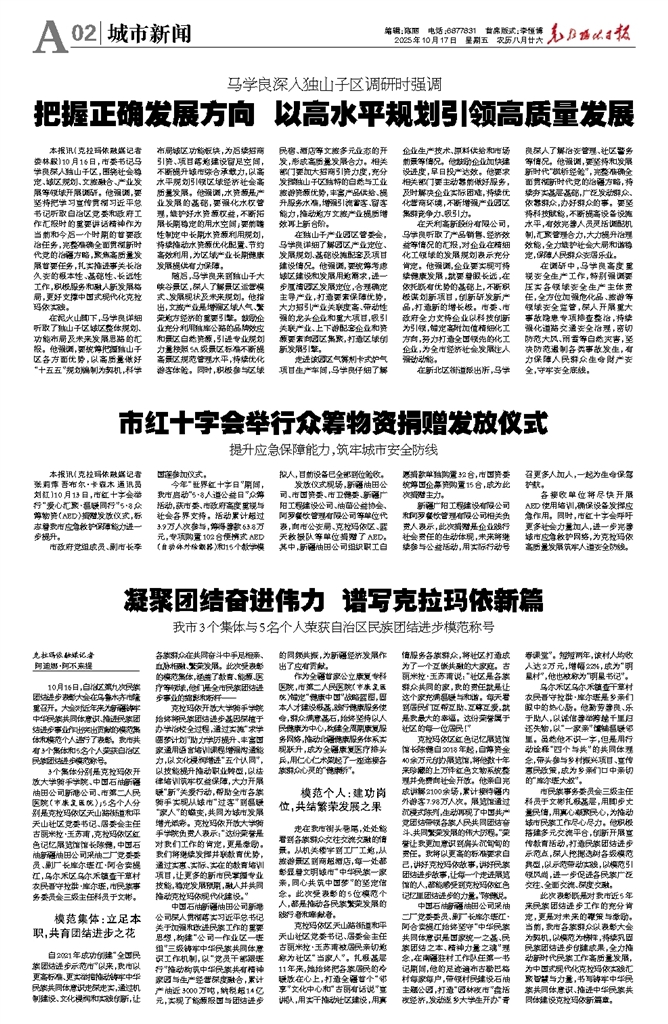 - 把握正确发展方向 以高水平规划引领高质量发展 本报讯(克拉玛依融媒记者 娄林毅)10月16日,市委书记马学良深入独山子区,围绕社会稳定、城区规划、文旅融合、产业发展等领域开展调研。他强调,要坚持把学习宣传贯彻习近平总书记听取自治区党委和政府工