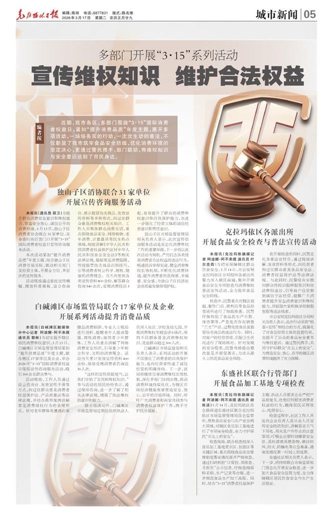 - 宣传维权知识 维护合法权益 编者按 近期,我市各区、多部门围绕“3·15”国际消费者权益日,紧扣“提升消费品质”年度主题,展开多项活动,一场场务实的行动、一次次生动的普法,不仅彰显了我市筑牢食品安全防线、优化消费环境的坚