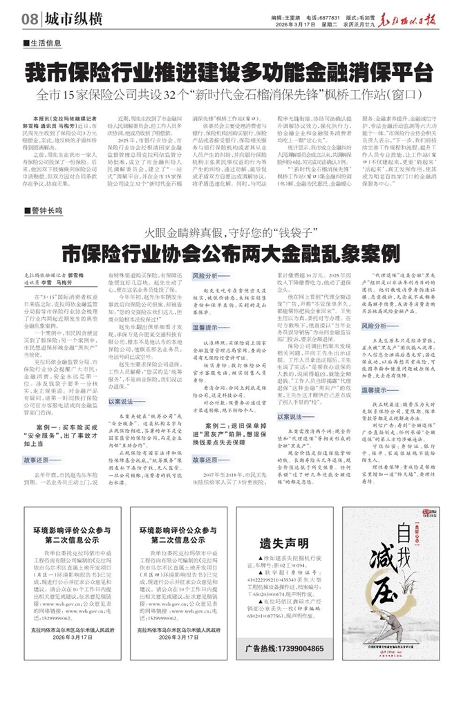 - 市保险行业协会公布两大金融乱象案例 克拉玛依融媒记者 郭雪梅 通讯员 李雪 马梅芳 在“3·15”国际消费者权益日来临之际,克拉玛依金融监管分局指导市保险行业协会梳理了行业内两起近期发生的典型金融乱象