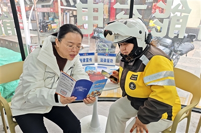 3月10日,克拉玛依区司法局昆仑司法所工作人员面向外卖骑手开展法律知识宣传活动。吕萍 摄