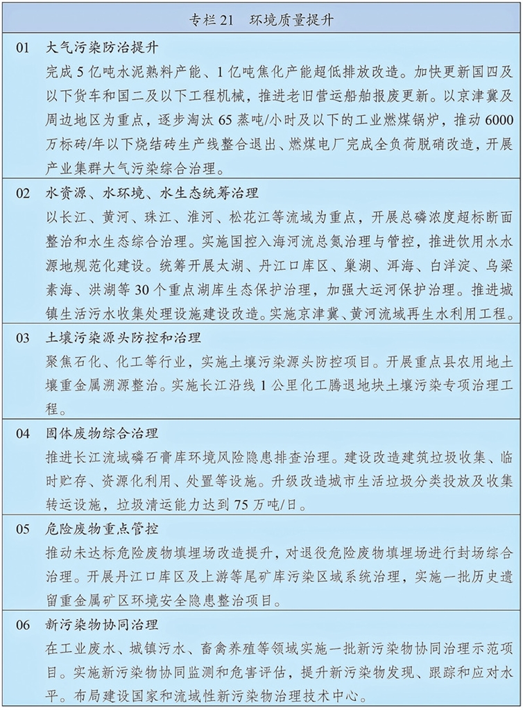 持续深入推进污染防治攻坚,以更高标准改善大气、水、土壤环境质量。以京津冀及周边、长三角、汾渭平原等重点区域为主战场,强化细颗粒物(PM2.5)控制,深入推进重点行业超低排放改造,推动挥发性有机物源头替代和全流程治理,制定下一阶段机动车排放和油品质量标准,深化大气环境绩效分级管理,氮氧化物、挥发性有机物排放量分别下降8%以上,进一步消除重污染天气。加强长江中游、成渝等区域大气污染防治。加强餐饮油烟、恶臭异味和环境噪声污染治理。统筹水资源、水环境、水生态治理,以解决全流域和跨省界突出问题为重点,加强重要江河湖库系统治理和生态保护,基本完成重点流域海域入河入海排污口排查整治,化学需氧量、总磷排放量分别下降6%,巩固城市黑臭水体治理成效、基本消除县乡黑臭水体。加强土壤污染源头防控,推进受污染耕地、建设用地安全利用。