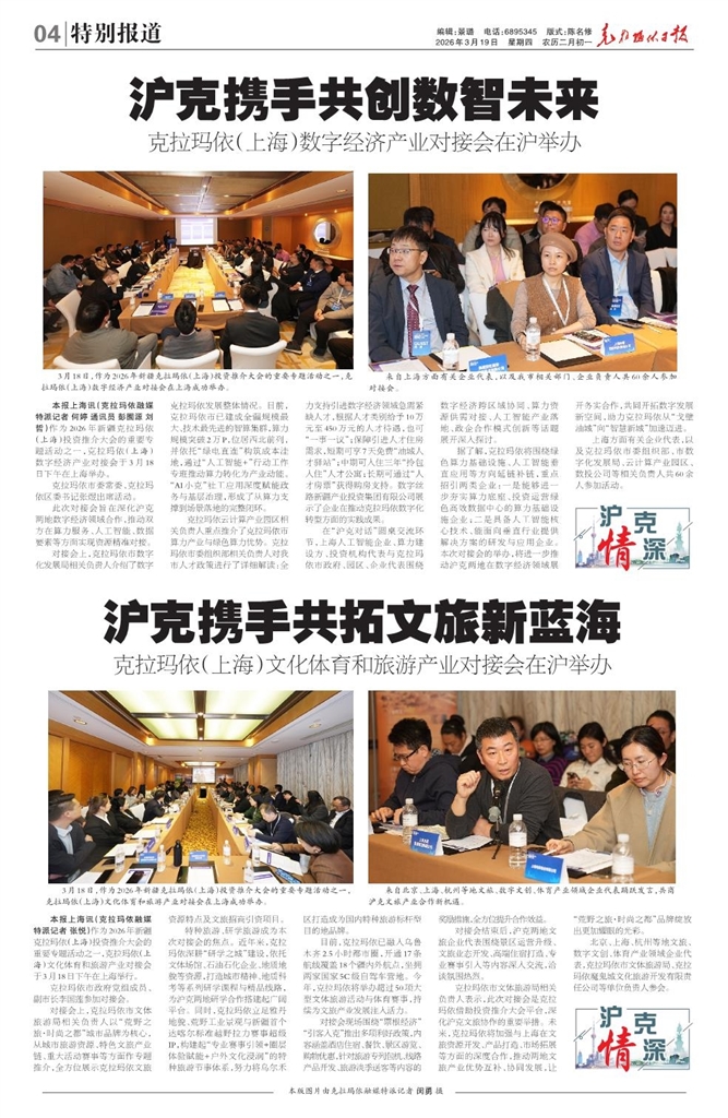 • 沪克携手共创数智未来   3月18日,作为2026年新疆克拉玛依(上海)投资推介大会的重要专题活动之一,克拉玛依(上海)数字经济产业对接会在上海成功举办。   来自上海方面有关企业代表,以及我市相关部门、企业负责人共60余