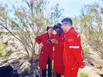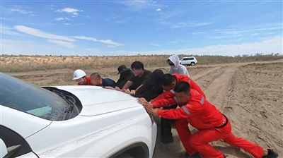 直播期间,工作车辆深陷沙漠,工作人员一起推车脱困。