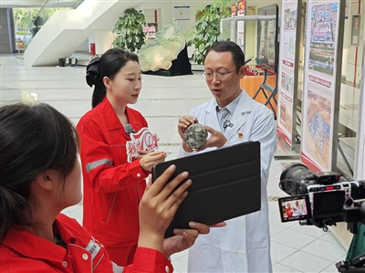 勘探开发研究院的嘉宾和主持人通过简单的实验,向网友介绍岩心的特性。