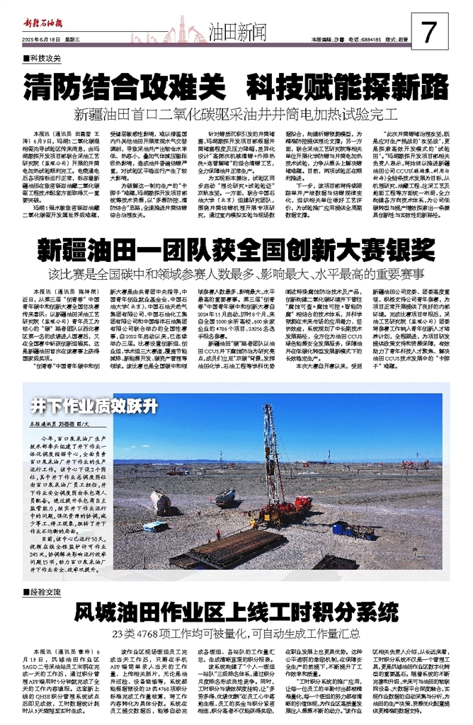 - 新疆油田一团队获全国创新大赛银奖 本报讯(通讯员 陈神根)近日,从第三届“创青春”中国青年碳中和创新大赛全国总决赛传来喜讯:以新疆油田采油工艺研究院(监理公司)青年员工为核心的“碳”路者团队以西北赛区第一名的成绩进入国赛后,又在